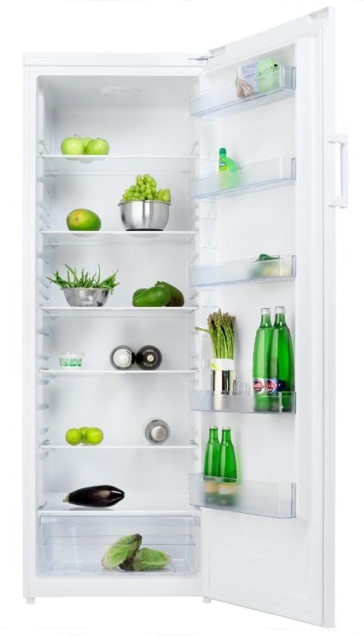 Monoklimatická chladnička, objem ledničky 331 l, energetická třída E, hlučnost 39 dB, zásuvka na ovoce a zeleninu, výškově nastavitelné skleněné police, LED osvětlení, mechanické ovládání, možnost otočení dveří, rozměry (VxŠxH) 170 x 60 x 60 cm.