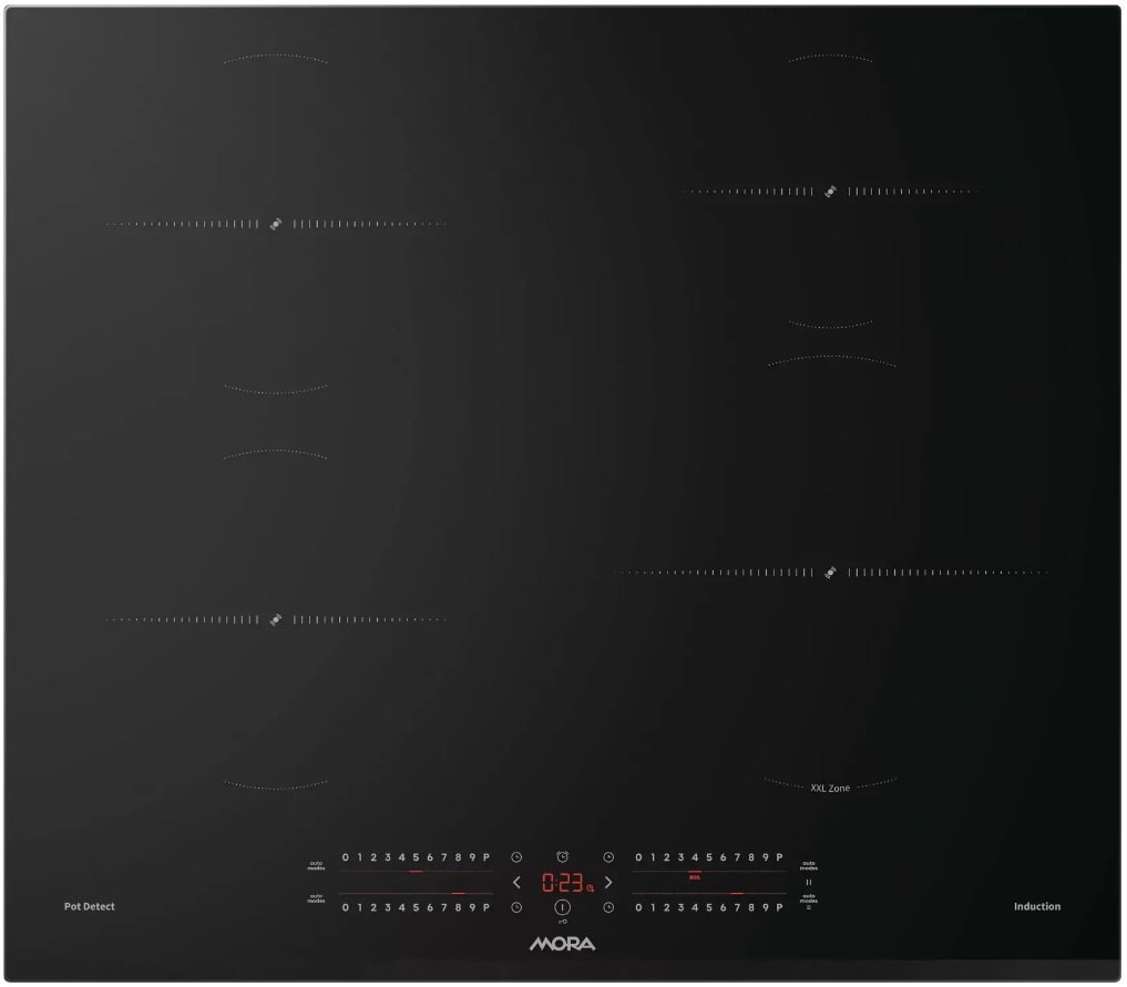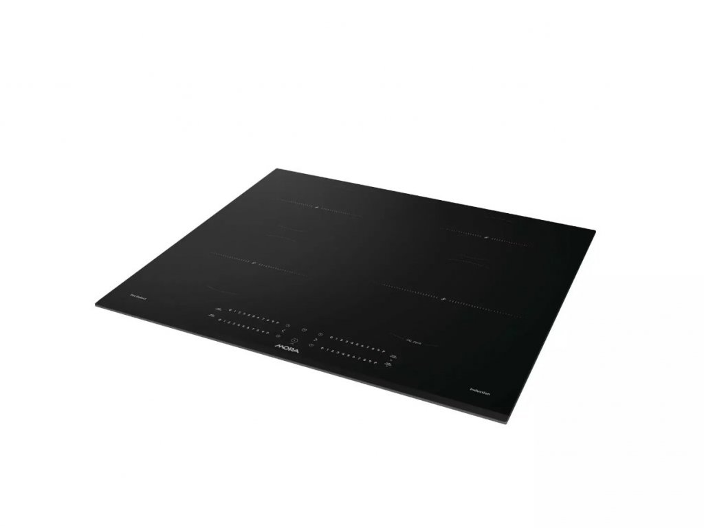 Indukční varná deska, šířka 59,5 cm, 4 varné zóny, připojení 220–240 V / 400 V, přední hrana zkosená, dotykové posuvné ovládání, funkce SuperBoost – extra výkon u všech varných zón, funkce Timer – časový spínač varných zón s automatickým vypnutím, funkce KeepWarm – udržení stabilní teploty při 70 °C, bezpečnostní prvky: dětský zámek, ukazatel zbytkového tepla, V × Š × H: 5,4 × 59,5 × 52 cm.