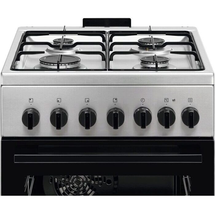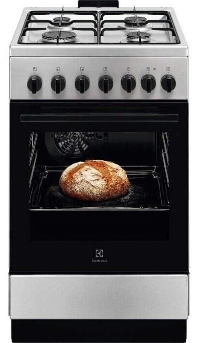 Kombinovaný sporák, energetická třída A, objem 57 l, horkovzdušná trouba s kruhovým topným tělesem, bezpečnostní/drátěné závěsy, hladký smalt, pojistka plynových hořáků, elektrické zapalování integrované v knoflíku, horký vzduch, mechanické – knoflíkové ovládání, gril/infragril, časovač/minutka, připojení 220–240 V, příslušenství: 1× plech na pečení koláčů, 1× plech na zachytávání mastnoty, 1× otočný rošt, rozměry (V x Š x H): 85,5 x 50 x 60 cm.