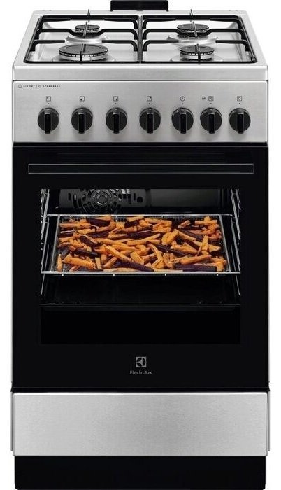 Kombinovaný sporák, energetická třída A, objem 57 l, horkovzdušná trouba s kruhovým topným tělesem, bezpečnostní/drátěné závěsy, funkce SteamBake – upečete dokonalé pečivo, muffiny a koláče, pojistka plynových hořáků, elektrické zapalování integrované v knoflíku, funkce AirFry pro přípravu hranolek a zeleniny s minimem tuku, mechanické – knoflíkové ovládání, gril/infragril, časovač/minutka, připojení 220–240 V, příslušenství: 1× plech na pečení koláčů, 1× plech na zachytávání mastnoty, 1× otočný rošt, 1× AirFry mřížka, rozměry (V x Š x H): 85,5 x 50 x 60 cm.
