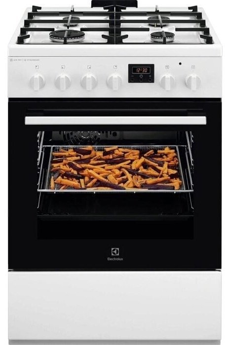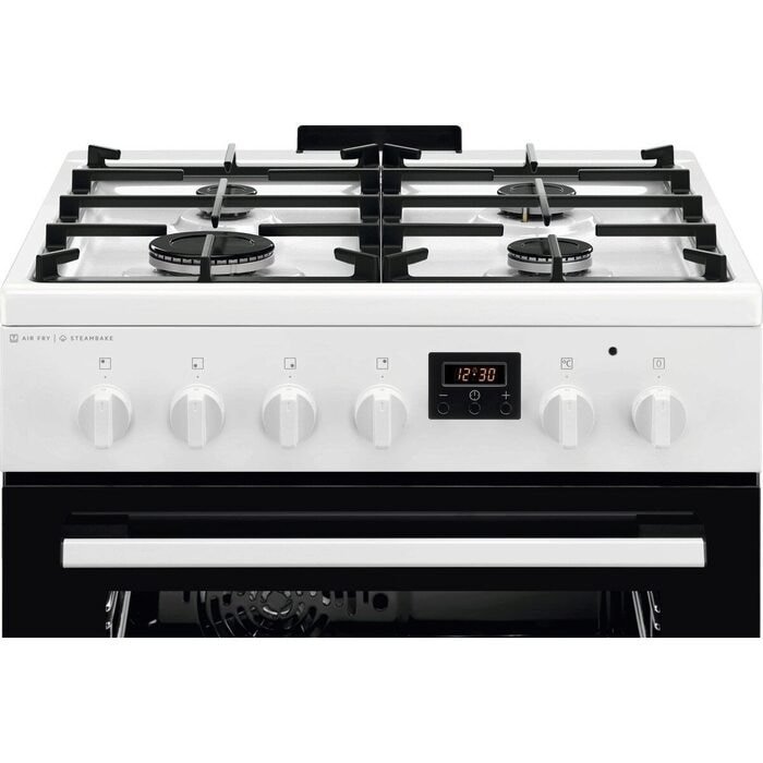 Kombinovaný sporák, energetická třída A, objem 57 l, horkovzdušná trouba s kruhovým topným tělesem, bezpečnostní/drátěné závěsy, displej, funkce SteamBake – upečete dokonalé pečivo, muffiny a koláče, pojistka plynových hořáků, elektrické zapalování integrované v knoflíku, funkce AirFry pro přípravu hranolek a zeleniny s minimem tuku, mechanické – knoflíkové ovládání, gril/infragril, časovač/minutka, připojení 220–240 V, příslušenství: 1× plech na pečení koláčů, 1× plech na zachytávání mastnoty, 1× otočný rošt, 1× AirFry mřížka, rozměry (V x Š x H): 85,7 x 60 x 60 cm.
