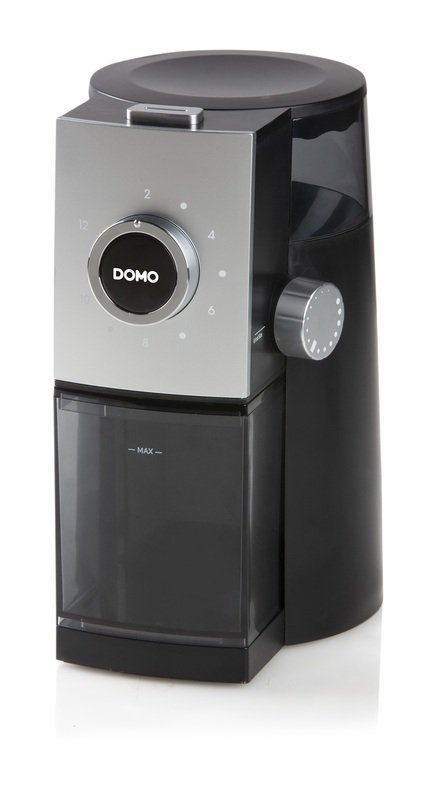 Elektrický mlýnek na kávu s mlecími kameny z vysokopevnostní oceli s plynulým nastavením hrubosti mletí a množství porcí kávy. Velká násypka na 300 g zrnkové kávy.