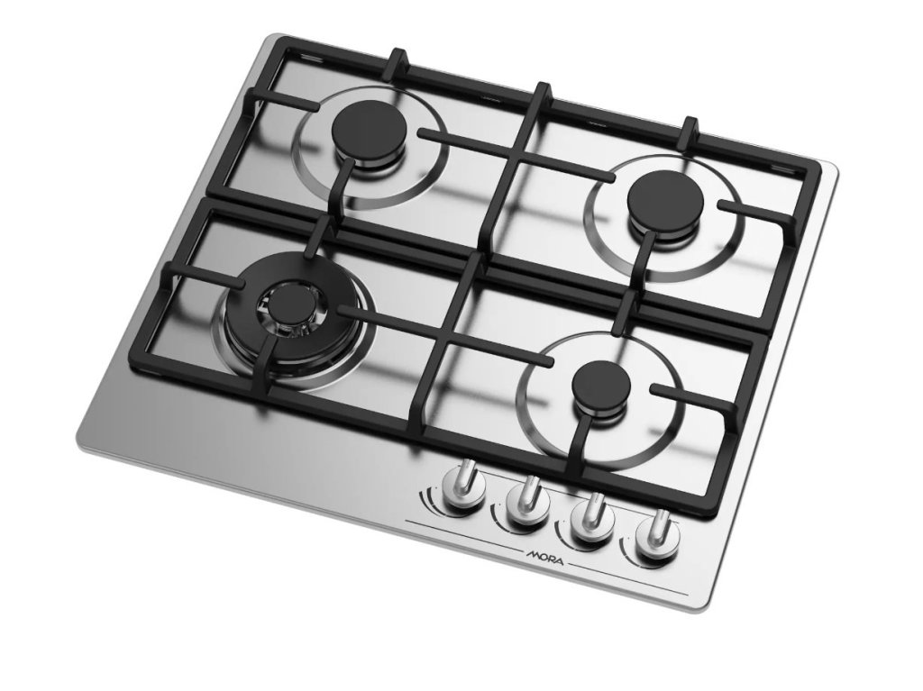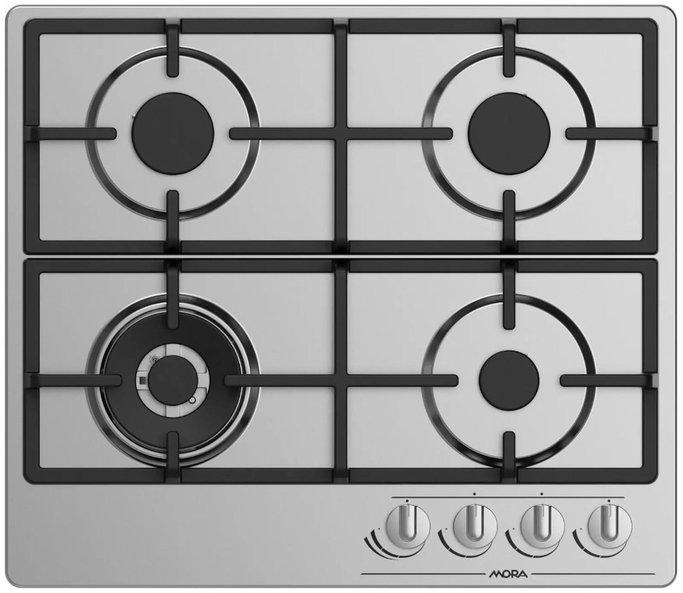 Plynová varná deska, 4 varné zóny, připojení 220–240 V, nerezový plech, dvoudílná litinová mřížka – zajistí stabilitu, mechanické – knoflíkové ovládání, elektrické zapalování hořáků v knoflících, extra dvojitý hořák WOK, bezpečnostní prvky: StopGas, rozměry (V x Š x H): 8,9 x 60 x 52 cm.