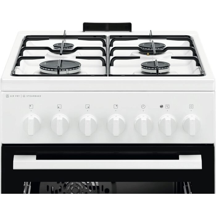 Kombinovaný sporák, energetická třída A, objem 57 l, horkovzdušná trouba s kruhovým topným tělesem, bezpečnostní/drátěné závěsy, AquaClean čištění, funkce SteamBake – upečete dokonalé pečivo, muffiny a koláče, pojistka plynových hořáků, elektrické zapalování integrované v knoflíku, funkce AirFry pro přípravu hranolek a zeleniny s minimem tuku, mechanické – knoflíkové ovládání, gril/infragril, časovač/minutka, připojení 220–240 V, příslušenství: 1× plech na pečení koláčů, 1× plech na zachytávání mastnoty, 1× otočný rošt, 1× AirFry mřížka, V × Š × H: 85,5 × 50 × 60 cm.