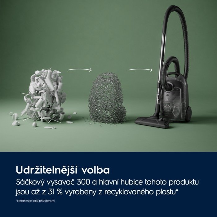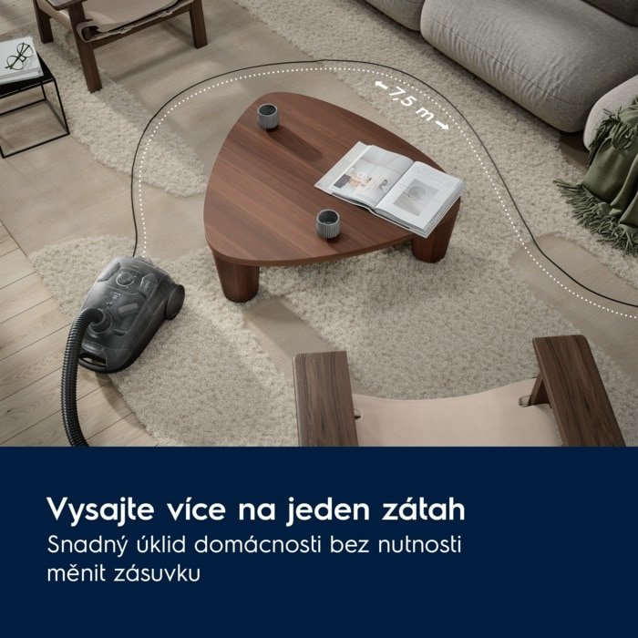 Sáčkový vysavač, akční rádius 7,5 m, hlučnost 78 dB, hubice na čalounění, štěrbinová, S-Bag sáček na prach, objem 3 l, HEPA filtr, omyvatelný, příkon 750 W.