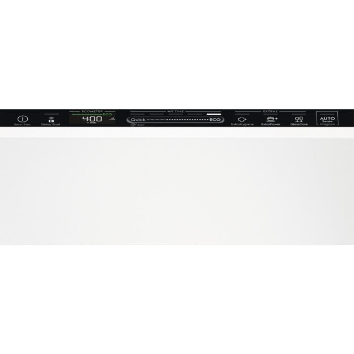 Vestavná myčka, plně integrovaný panel, šířka 59,6 cm, 14 sad nádobí, energetická třída A, hlučnost 43 dB, automatické otevírání dvířek – AirDry, 10 let záruka na motor, příborová zásuvka MaxiFlex, technologie SatelliteClean, dotykové ovládání QuickSelect s Wi-fi, indikátor stavu mytí, odložený start, systém AquaStop zabrání případnému úniku vody, V × Š × H: 81,8 × 59,6 × 55 cm.