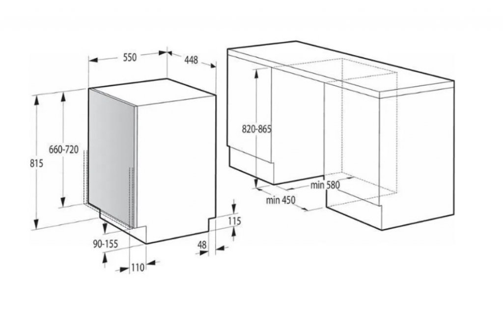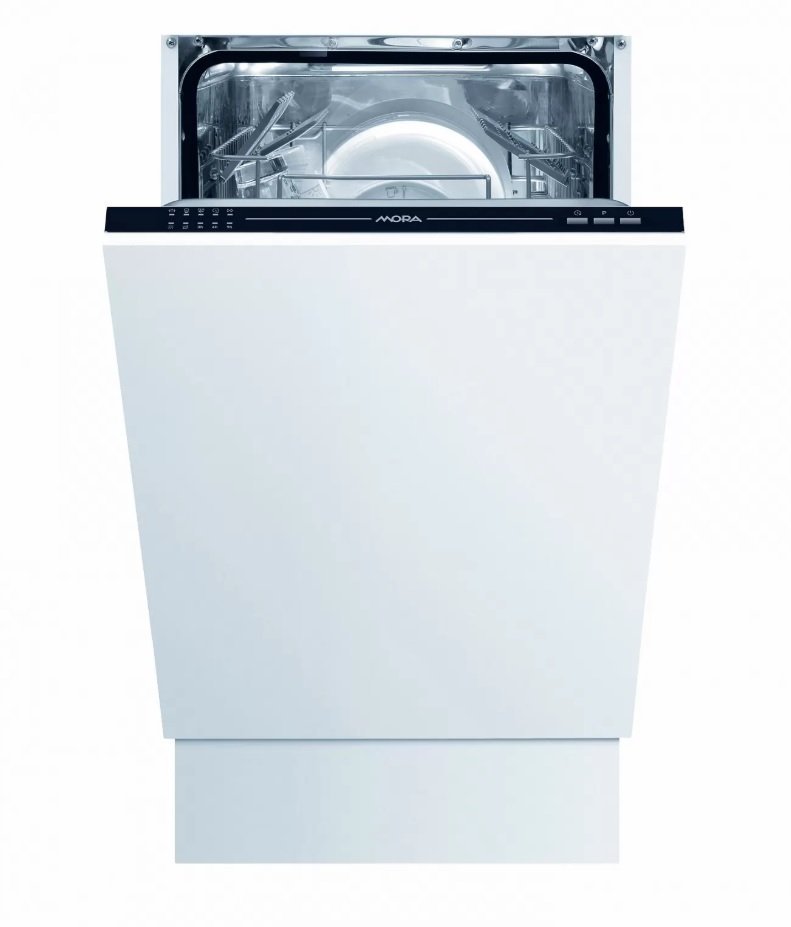 Vestavná myčka nádobí, plně integrovaný panel, šířka 45 cm, 9 sad nádobí, energetická třída E, hlučnost 47 dB, samočisticí filtr, ECO program, program na sklo, odložení mytí až o 24 hodin, bezpečnostní prvky: ochrana proti úniku vody AquaStop, V × Š × H: 81,5 × 44,8 × 55 cm.