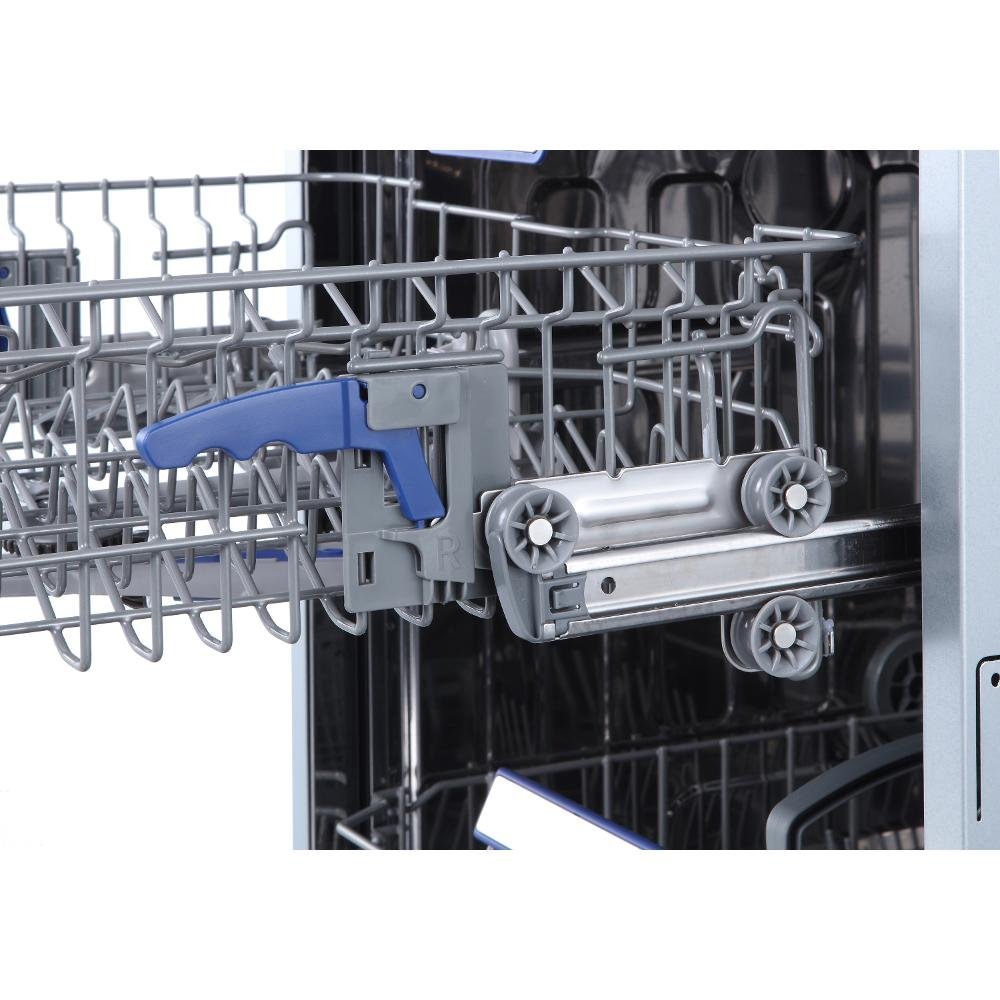 Vestavná myčka, plně integrovaný panel, energetická třída C, 14 sad nádobí, příborová zásuvka, hlučnost 44 dB, světelný podlahový paprsek, automatické otevírání dvířek, 6 programů, poloviční náplň, odložený start, bezpečnostní prvky: AquaStop, rozměry (V x Š x H): 81,5 x 60 x 55 cm.