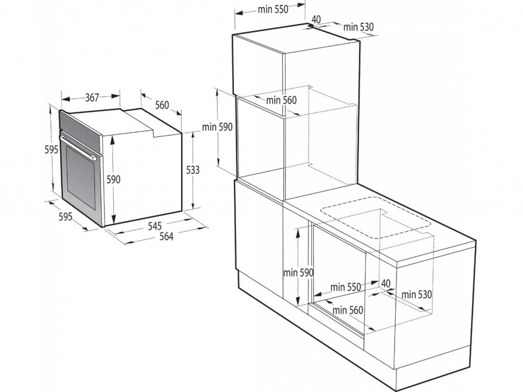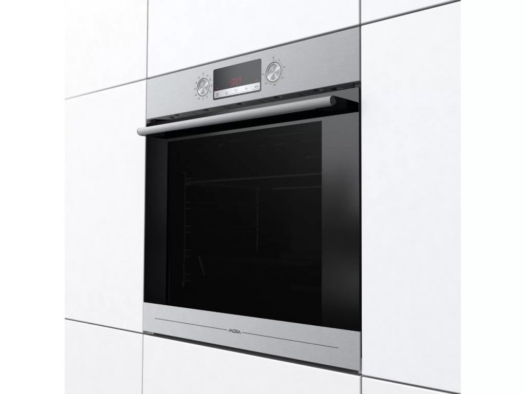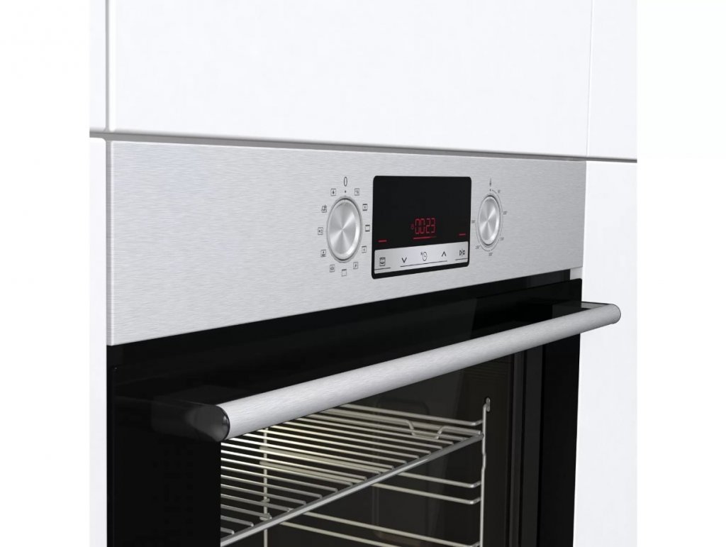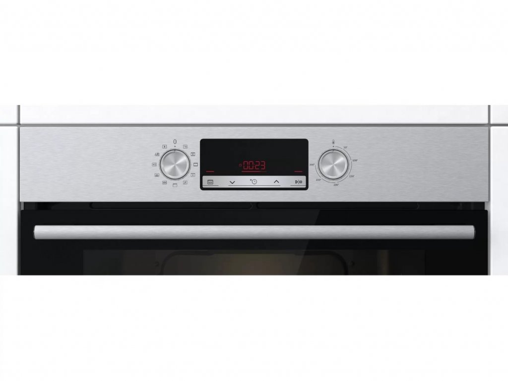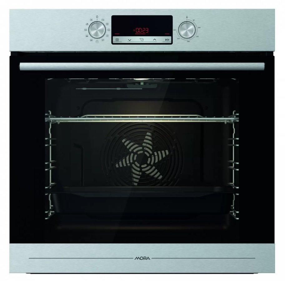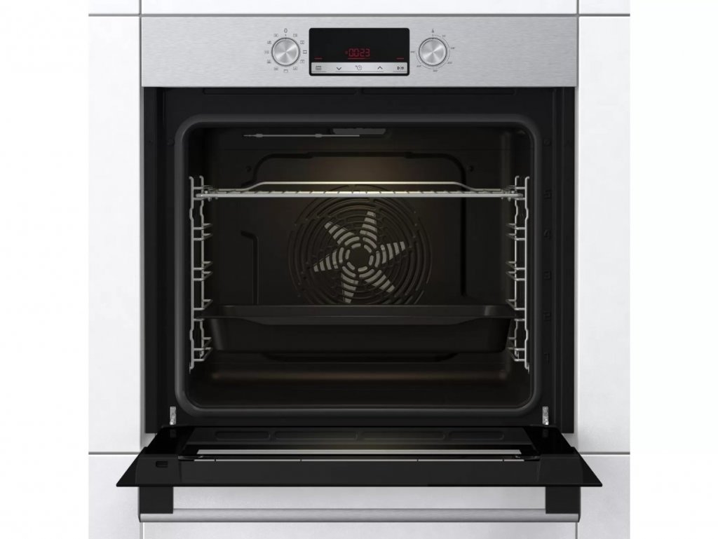 Vestavná trouba, energetická třída A, objem 77 l, dolní a horní ohřev s ventilátorem a grilem, drátěné rošty, program Pizza – připraví křupavou pizzu při 300 °C, program pro pomalé pečení – upeče šťavnaté a křehké maso, program pro mražená a hotová jídla, program Pomalé pečení – díky jemnému a pomalému pečení bude maso vždy křehké a šťavnaté, vnitřní osvětlení trouby, funkce pečení v krocích, V × Š × H: 59,5 × 59,5 × 56,4 cm.