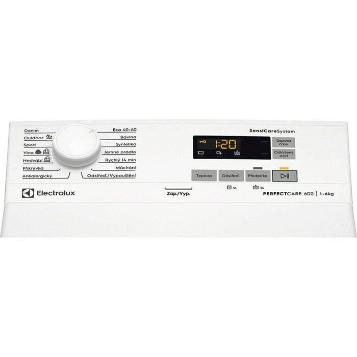 Pračka vrchem plněná, energetická třída A, kapacita pračky 6 kg, spotřeba energie 42 kWh/100 cyklů, spotřeba vody na cyklus 43 l, váhová automatika, odložený start, rychlý program, displej, dětská pojistka, SensiCare, max. rychlost při odstřeďování 1 300 ot/min, rozměry (V x Š x H): 89 x 40 x 60 cm.